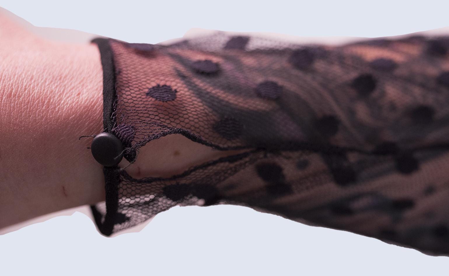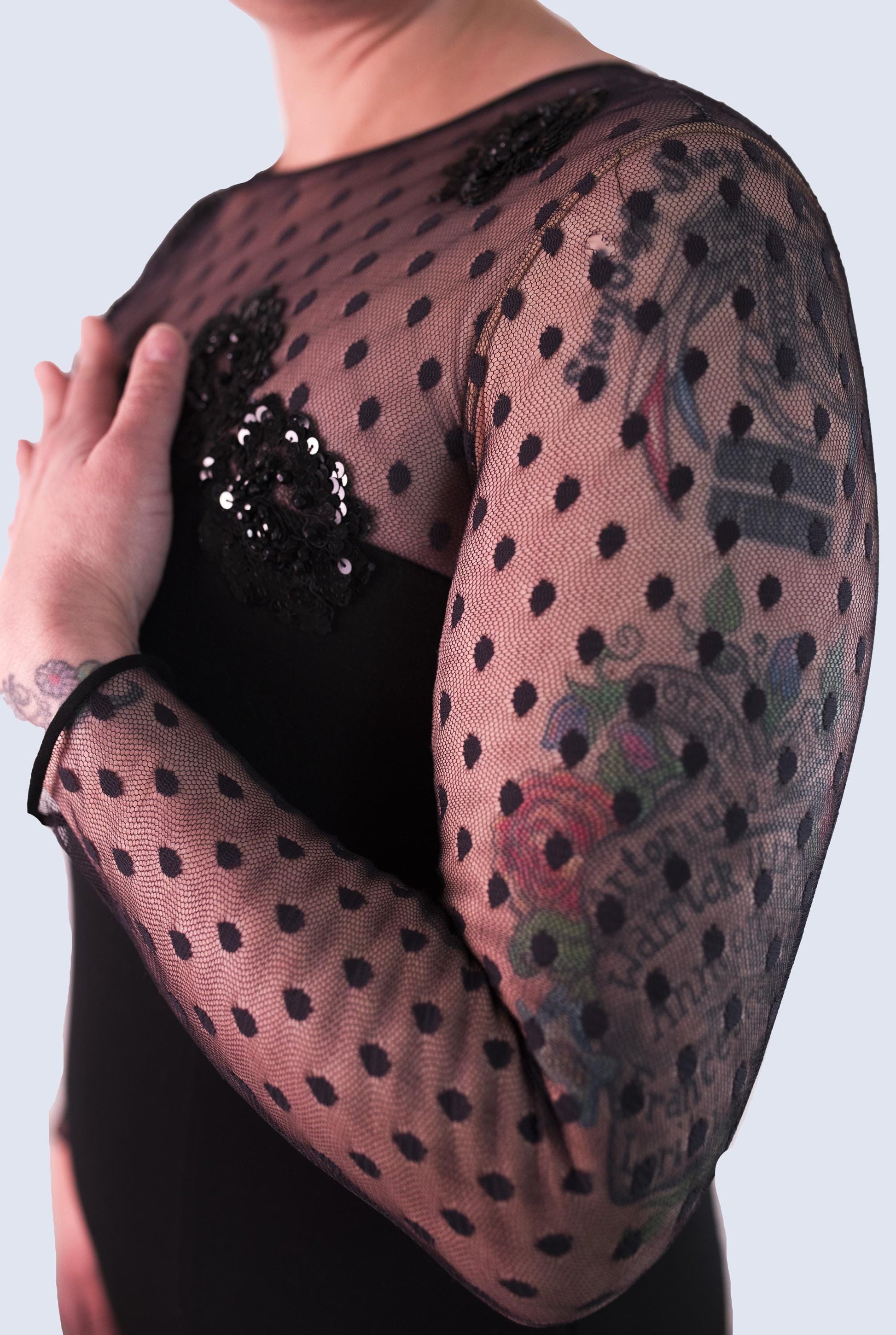 • Sheer Polka Dot Mesh Sleeves: Long sleeves crafted from delicate, sheer mesh with a chic polka-dot pattern.