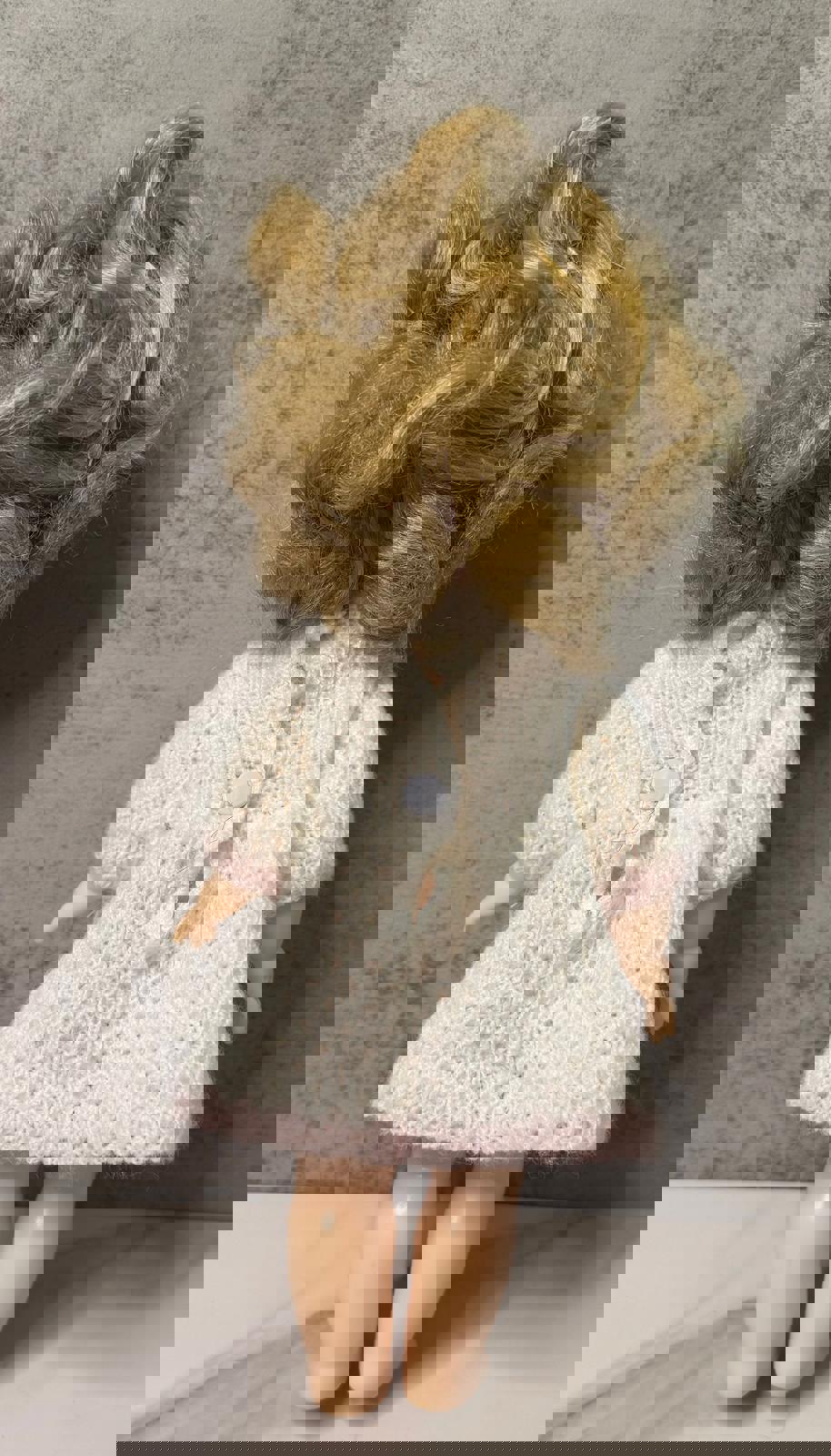This little Effanbee original is bringing maximum charm—and just a hint of chaos. Dressed in a delicate hand-knit white dress with pale pink trim and a button-up back, she’s ready to twirl her way into your collection… or your dreams.