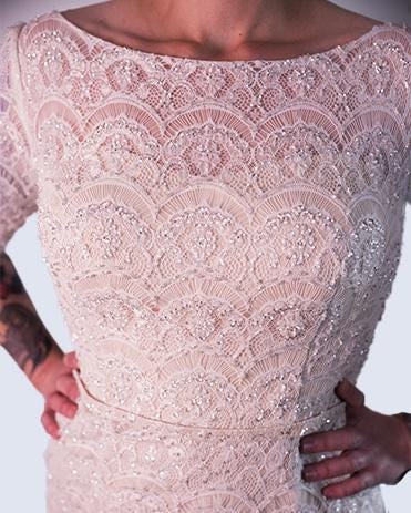 • Intricate scalloped lace pattern with sparkling embellishments throughout.