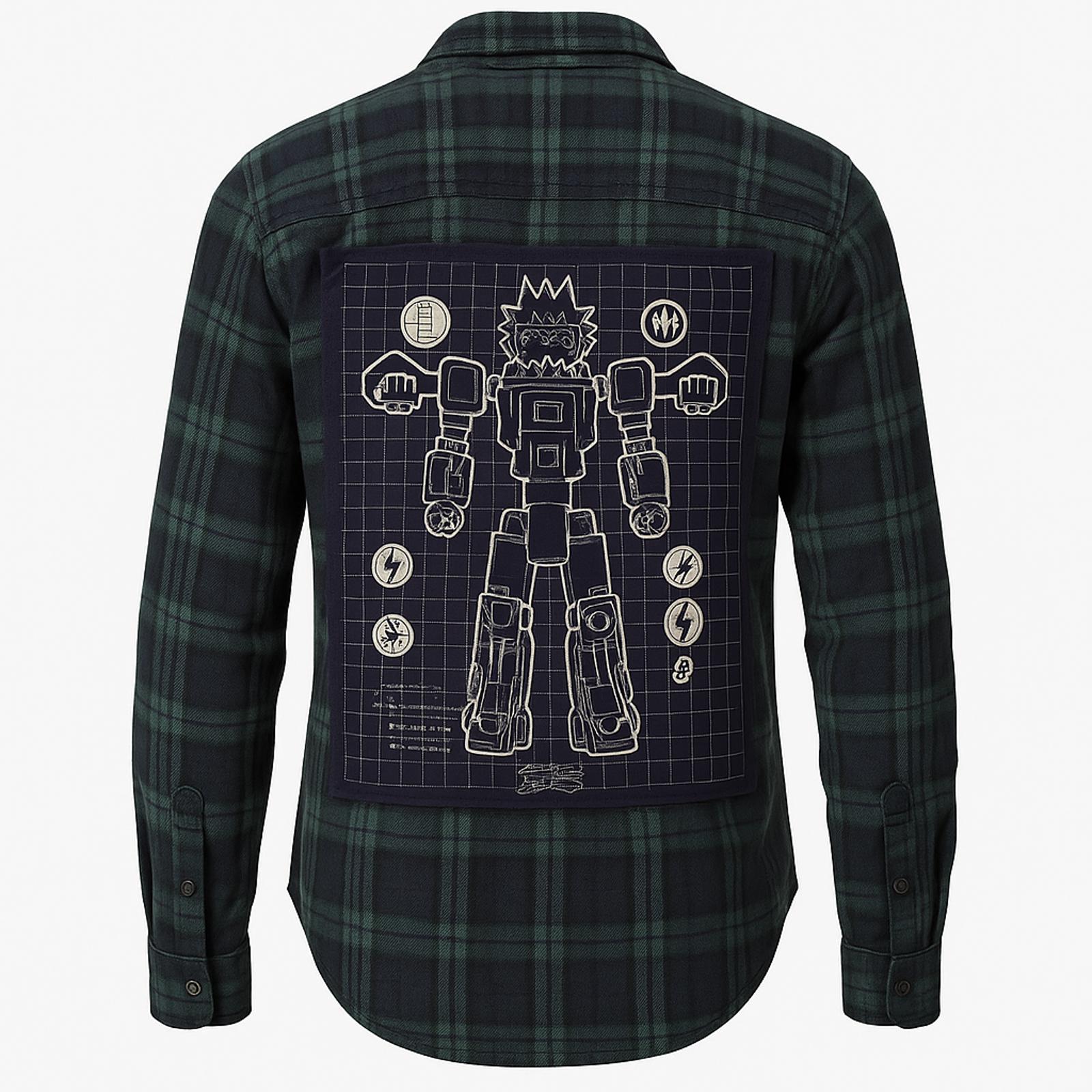 This upcycled J.Crew men’s medium flannel features a bold Power Rangers Megazord Blueprint patch stitched across the back, transforming a classic plaid into a wearable tribute to retro hero nostalgia.